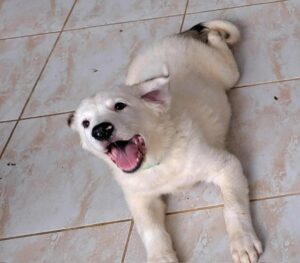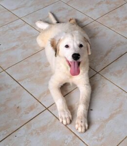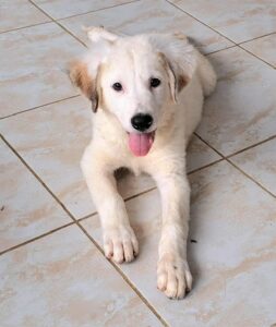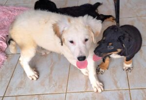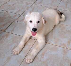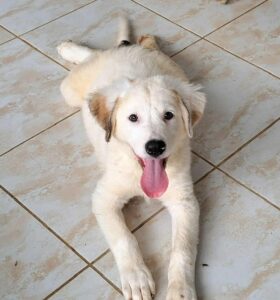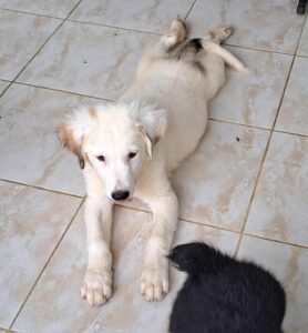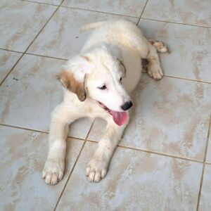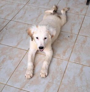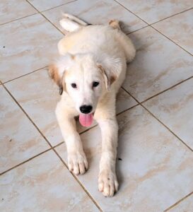Archer’s mother was found abandoned, already pregnant. She gave birth, at the shelter to four puppies. Although we don’t know the size of the father, mum is small size (only 33cm). Archer is the biggest of the puppies mainly because of his long legs so maybe he takes after his dad. But look at his beautiful colour – fluffy cream with a few darker accents – a really handsome friendly boy.