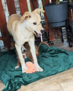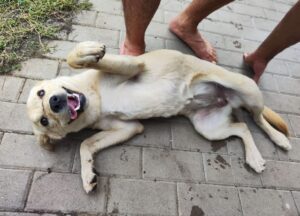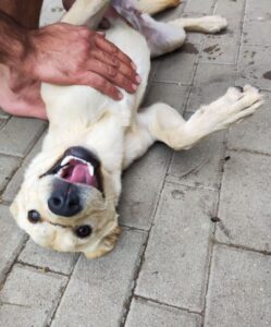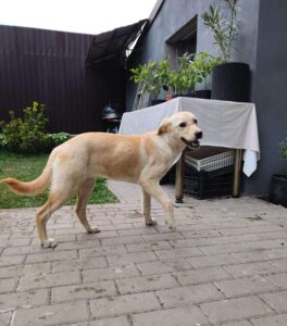 Meda was found abandoned at a petrol station and is now in foster with other dogs and cats. She is very people friendly and walks nicely on the lead. She has a mark on her nose that looks like a burn that was done intentionally because of an old countryside tradition. It’s possible the hair might not grow back and she’ll be left with a scar but Meda will still be a beautiful girl ready for a loving family. Although she is a mixed breed she looks as she might have labrador retriever in her background.