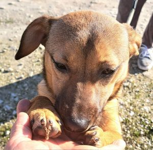 Tinca’s mum was found sheltering under a bridge in torrential rain with four puppies. Sadly another two puppies had already been swept away and drowned. Fortunately our rescuers were able to save the rest of the little family. Mother and pups were kept in foster while the puppies were small. Now they have moved to the shelter as they are old enough to find homes. Tinca is a real sweetie who loves a cuddle. Mum is medium sized and we expect the pups to be of similar size.