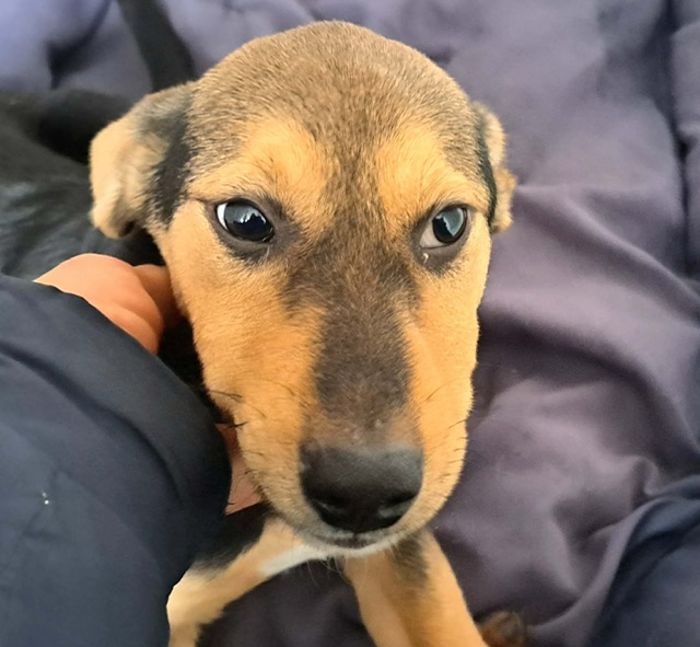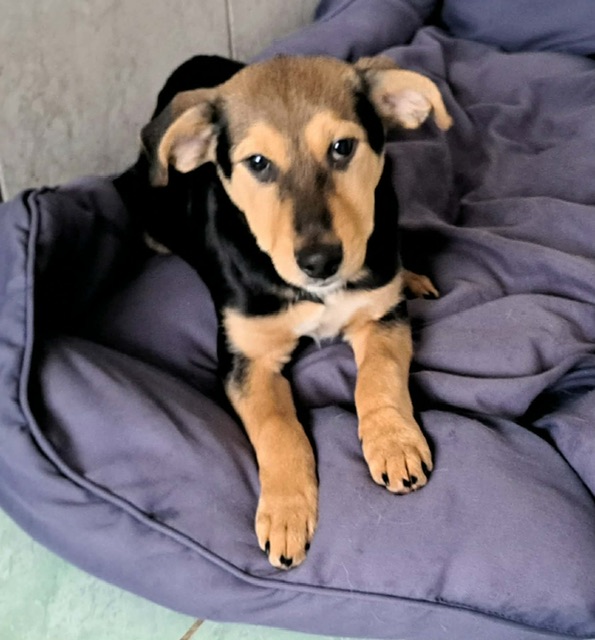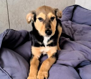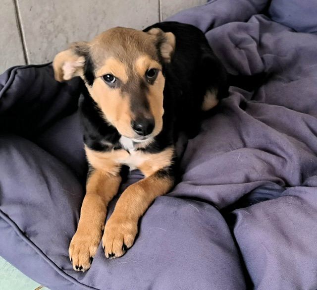 Tinky’s mum was found sheltering under a bridge in torrential rain with four puppies. Sadly another two puppies had already been swept away and drowned. Fortunately our rescuers were able to save the rest of the little family. Mother and pups were kept in foster while the puppies were small. Now they have moved to the shelter as they are old enough to find homes. Tinky is the only boy in the group – a handsome friendly tricoloured puppy. Mum is medium sized and we expect the pups to be of similar size.